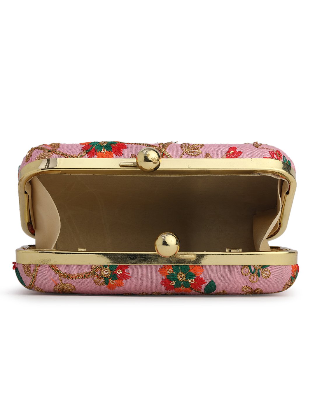 Pink & Gold Embroidered Box clutches, Has gold chain shoulder strap, 1 main compartment with twist closure